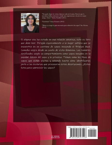 Si alguna vez ha estado en una relación amorosa, este es el libro que debe leer. Dirigido especialmente a la mujer soltera que se encuentra en un pantano de sapos buscando el Principe Azul. Comedia negra de un punto de vista femenino. Los hombres son clasificados según su comportamiento como sapos basados en la popular fábula del sapo y la princesa. Temas como los típos de sapos que están vivitos y coleando, ¿Cuántos sapos se debe besar antes de encontrar el principe azul? y ¿Cómo sobrevivirlos?