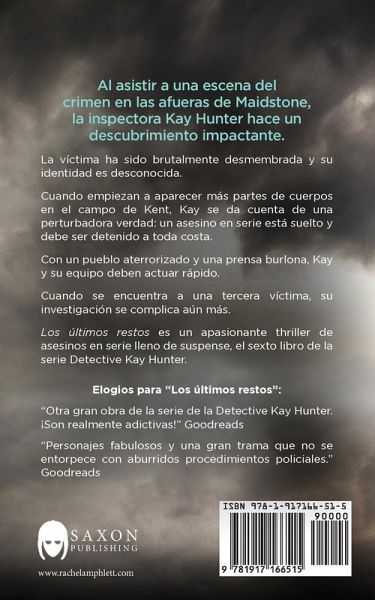Al asistir a una escena del crimen en las afueras de Maidstone, la inspectora Kay Hunter hace un descubrimiento impactante. La víctima ha sido brutalmente desmembrada y su identidad es desconocida. Cuando empiezan a aparecer más partes de cuerpos en el campo de Kent, Kay se da cuenta de una perturbadora verdad: un asesino en serie está suelto y debe ser detenido a toda costa. Con un pueblo aterrorizado y una prensa burlona, Kay y su equipo deben actuar rápido. Cuando se encuentra a una tercera víctima, su investigación se complica aún más. Los últimos restos es un apasionante thriller de asesinos en serie lleno de suspense, el sexto libro de la serie Detective Kay Hunter. Elogios para Los últimos restos: "Otra gran obra de la serie de la Detective Kay Hunter. ¡Son realmente adictivas!" Goodreads "Personajes fabulosos y una gran trama que no se entorpece con aburridos procedimientos policiales." Goodreads