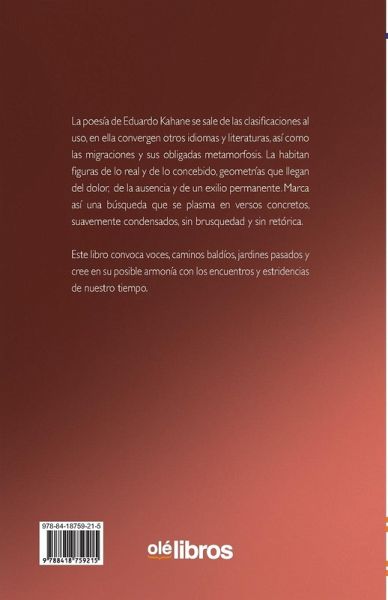 La poesía de Eduardo Kahane se sale de las clasificaciones al uso, en ella convergen otros idiomas y literaturas, así como las migraciones y sus obligadas metamorfosis. La habitan figuras de lo real y de lo concebido, geometrías que llegan del dolor, de la ausencia y de un exilio permanente. Marca así una búsqueda que se plasma en versos concretos, suavemente condensados, sin brusquedad y sin retórica. Este libro convoca voces, caminos baldíos, jardines pasados y cree en su posible armonía con los encuentros y estridencias de nuestro tiempo.