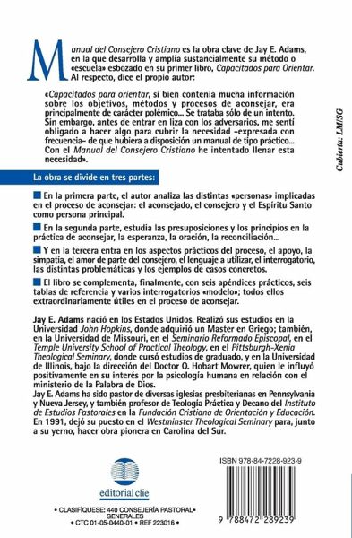 La ¿¿consejer¿¿a cristianä¿, o, dicho de otra forma, el tratamiento por parte del pastor, ancianos o l¿¿deres de iglesias, de los problemas morales y psicol¿¿gicos de los miembros, se est¿¿ transformando cada d¿¿a m¿¿s en una labor tan necesaria como dif¿¿cil. El ¿¿aconsejar¿¿ cristiano debe estar al d¿¿a y tener respuestas para las dificultades que plantea nuestra sociedad contempor¿¿nea, pero debe estar a la vez claramente fundamentado en las ense¿¿anzas de la Palabra de Dios. La presente obra, abarrotada de nuevos principios y t¿¿cnicas, aunque todas ellas con base fundamental en la Biblia, convertir¿¿ la pr¿¿ctica del aconsejar cristiano en algo mucho m¿¿s racional y eficaz.