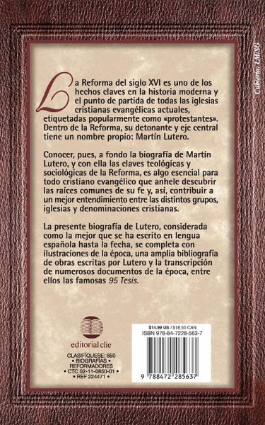 La Reforma del siglo XVI es uno de los hechos claves en la historia moderna y el punto de partida de todas las iglesias cristianas evang¿¿licas actuales etiquetadas popularmente como ¿¿protestantes¿¿. Dentro de la Reforma, su detonante y eje central tiene un nombre propio: Mart¿¿n Lutero. Conocer, pues, a fondo la biograf¿¿a de Mart¿¿n Lutero y con ella las claves teol¿¿gicas y sociol¿¿gicas de la Reforma es algo esencial para todo cristiano evang¿¿lico que anhele descubrir las rä¿ces comunes de su fe y, as¿¿, contribuir a un mejor entendimiento entre las distintos grupos, iglesias y denominaciones cristianas. La presente biograf¿¿a de Lutero, considerada como la mejor que se ha escrito en lengua espä¿ola hasta la fecha, se completa con ilustraciones de la ¿¿poca, una amplia bibliograf¿¿a de obras escritas por Lutero y la transcripci¿¿n de numerosos documentos de la ¿¿poca, entre ellos las famosas 95 Tesis.