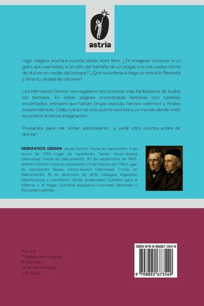 Algo mágico ocurrirá cuando abrás este libro. ¿Te imaginás conocer a un gato que usa botas, a un niño del tamaño de un pulgar o a una casita hecha de dulces en medio del bosque? ¿Qué sucedería si llega un extraño flautista y llena tu ciudad de ratones? Los Hermanos Grimm nos regalaron los cuentos más fantásticos de todos los tiempos. En estas páginas encontrarás historias con castillos encantados, animales que hablan, brujas astutas, héroes valientes y finales sorprendentes. Cada cuento es una puerta secreta a un mundo donde todo es posible si tienes imaginación. Preparate para reír, soñar, asombrarte... ¡y pedir otro cuento antes de dormir! Sobre los autores:HERMANOS GRIMM. Jacob Grimm. Fecha de nacimiento: 4 de enero de 1785 Lugar de nacimiento: Hanau, Hesse-Kassel (Alemania). Fecha de fallecimiento: 20 de septiembre de 1863. Wilhelm Grimm Fecha de nacimiento: 24 de febrero de 1786. Lugar de nacimiento: Hanau, Hesse-Kassel (Alemania). Fecha de fallecimiento: 16 de diciembre de 1859. Filólogos, lingüistas, bibliotecarios y escritores. Obras destacadas: Cuentos para la infancia y el hogar; Cuentos populares; Leyendas alemanas y Diccionario alemán.