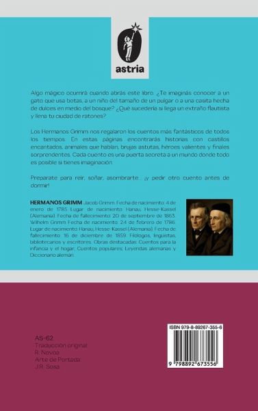 Algo mágico ocurrirá cuando abrás este libro. ¿Te imaginás conocer a un gato que usa botas, a un niño del tamaño de un pulgar o a una casita hecha de dulces en medio del bosque? ¿Qué sucedería si llega un extraño flautista y llena tu ciudad de ratones? Los Hermanos Grimm nos regalaron los cuentos más fantásticos de todos los tiempos. En estas páginas encontrarás historias con castillos encantados, animales que hablan, brujas astutas, héroes valientes y finales sorprendentes. Cada cuento es una puerta secreta a un mundo donde todo es posible si tienes imaginación. Preparate para reír, soñar, asombrarte... ¡y pedir otro cuento antes de dormir! Sobre los autores:HERMANOS GRIMM. Jacob Grimm. Fecha de nacimiento: 4 de enero de 1785 Lugar de nacimiento: Hanau, Hesse-Kassel (Alemania). Fecha de fallecimiento: 20 de septiembre de 1863. Wilhelm Grimm Fecha de nacimiento: 24 de febrero de 1786. Lugar de nacimiento: Hanau, Hesse-Kassel (Alemania). Fecha de fallecimiento: 16 de diciembre de 1859. Filólogos, lingüistas, bibliotecarios y escritores. Obras destacadas: Cuentos para la infancia y el hogar; Cuentos populares; Leyendas alemanas y Diccionario alemán.