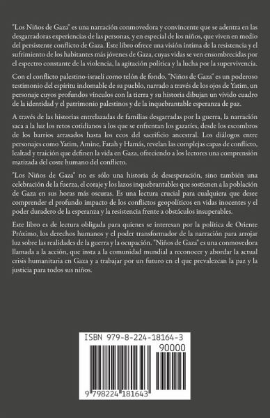 "Los Niños de Gaza" es una narración conmovedora y convincente que se adentra en las desgarradoras experiencias de las personas, y en especial de los niños, que viven en medio del persistente conflicto de Gaza. Este libro ofrece una visión íntima de la resistencia y el sufrimiento de los habitantes más jóvenes de Gaza, cuyas vidas se ven ensombrecidas por el espectro constante de la violencia, la agitación política y la lucha por la supervivencia. Con el conflicto palestino-israelí como telón de fondo, "Niños de Gaza" es un poderoso testimonio del espíritu indomable de su pueblo, narrado a través de los ojos de Yatim, un personaje cuyos profundos vínculos con la tierra y su historia dibujan un vívido cuadro de la identidad y el patrimonio palestinos y de la inquebrantable esperanza de paz. A través de las historias entrelazadas de familias desgarradas por la guerra, la narración saca a la luz los retos cotidianos a los que se enfrentan los gazatíes, desde los escombros de los barrios arrasados hasta los ecos del sacrificio ancestral. Los diálogos entre personajes como Yatim, Amine, Fatah y Hamás, revelan las complejas capas de conflicto, lealtad y traición que definen la vida en Gaza, ofreciendo a los lectores una comprensión matizada del coste humano del conflicto. "Los Niños de Gaza" no es sólo una historia de desesperación, sino también una celebración de la fuerza, el coraje y los lazos inquebrantables que sostienen a la población de Gaza en sus horas más oscuras. Es una lectura crucial para cualquiera que desee comprender el profundo impacto de los conflictos geopolíticos en vidas inocentes y el poder duradero de la esperanza y la resistencia frente a obstáculos insuperables. Este libro es de lectura obligada para quienes se interesan por la política de Oriente Próximo, los derechos humanos y el poder transformador de la narración para arrojar luz sobre las realidades de la guerra y la ocupación. "Niños de Gaza" es una conmovedora llamada a la acción, que insta a la comunidad mundial a reconocer y abordar la actual crisis humanitaria en Gaza y a trabajar por un futuro en el que prevalezcan la paz y la justicia para todos sus niños.