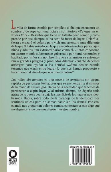 La vida de Bruno cambia por completo el día que encuentra un sombrero de copa con una nota en su interior: "Te esperan en Nueva York". Descubre que tiene un talento poco común y comprende por qué siempre se ha sentido fuera de lugar. Dejará su tierra y cruzará el océano para vivir una aventura muy diferente de la que él había soñado, en la que encontrará a otros personajes, niños y adultos, tan extraordinarios como él. Los niños sin nombre es una novela de aventuras sin tregua, repleta de personajes luchadores que se encuentran a sí mismos de la mano de sus amigos. Habla de la necesidad que tenemos de pertenecer a algún lugar y, al mismo tiempo, de dejarlo todo atrás; de lo que se oculta bajo la superficie de los lugares que idealizamos; habla, sobre todo, de la paradoja de la identidad: nos sentimos únicos pero no somos nadie sin los demás. Por eso, cuando nos preguntan quiénes somos, contestamos con algo que no elegimos, sino que nos dieron: nuestro nombre.