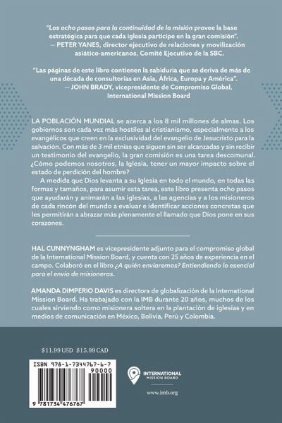 LA POBLACIÓN MUNDIAL se acerca a los 8 mil millones de almas. Los gobiernos son cada vez más hostiles al cristianismo, especialmente a los evangélicos que creen en la exclusividad del evangelio de Jesucristo para la salvación. Con más de 3 mil etnias que siguen sin ser alcanzadas y sin recibir un testimonio del evangelio, la gran comisión es una tarea descomunal. ¿Cómo podemos nosotros, la Iglesia, tener un mayor impacto sobre el estado de perdición del hombre? A medida que Dios levanta a su Iglesia en todo el mundo, en todas las formas y tamaños, para asumir esta tarea, este libro presenta ocho pasos que ayudarán y animarán a las iglesias, a las agencias y a los misioneros de cada rincón del mundo a evaluar e identificar acciones concretas que les permitirán a abrazar más plenamente el llamado que Dios pone en sus corazones.