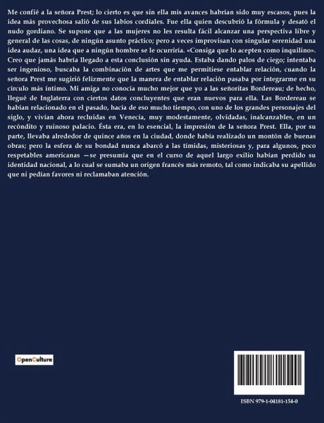 Me confié a la señora Prest; lo cierto es que sin ella mis avances habrían sido muy escasos, pues la idea más provechosa salió de sus labios cordiales. Fue ella quien descubrió la fórmula y desató el nudo gordiano. Se supone que a las mujeres no les resulta fácil alcanzar una perspectiva libre y general de las cosas, de ningún asunto práctico; pero a veces improvisan con singular serenidad una idea audaz, una idea que a ningún hombre se le ocurriría. «Consiga que lo acepten como inquilino». Creo que jamás habría llegado a esta conclusión sin ayuda. Estaba dando palos de ciego; intentaba ser ingenioso, buscaba la combinación de artes que me permitiese entablar relación, cuando la señora Prest me sugirió felizmente que la manera de entablar relación pasaba por integrarme en su círculo más íntimo. Mi amiga no conocía mucho mejor que yo a las señoritas Bordereau; de hecho, llegué de Inglaterra con ciertos datos concluyentes que eran nuevos para ella. Las Bordereau se habían relacionado en el pasado, hacía de eso mucho tiempo, con uno de los grandes personajes del siglo, y vivían ahora recluidas en Venecia, muy modestamente, olvidadas, inalcanzables, en un recóndito y ruinoso palacio. Ésta era, en lo esencial, la impresión de la señora Prest. Ella, por su parte, llevaba alrededor de quince años en la ciudad, donde había realizado un montón de buenas obras; pero la esfera de su bondad nunca abarcó a las tímidas, misteriosas y, para algunos, poco respetables americanas ¿se presumía que en el curso de aquel largo exilio habían perdido su identidad nacional, a lo cual se sumaba un origen francés más remoto, tal como indicaba su apellido que ni pedían favores ni reclamaban atención.