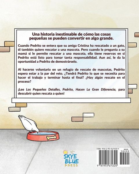 Una historia inestimable de cómo las cosas pequeñas se pueden convertir en algo grande. Cuando Pedrito se entera que su amiga Cristina ha rescatado a un gato, él también quiere rescatar a una mascota. Pero cuando le pregunta a su mamá si le permite rescatar a una mascota, ella tiene reservas en si Pedrito está listo para tomar tanta responsabilidad. Aun así, le da la oportunidad a Pedrito de demostrárselo. Al hacerse voluntario en un refugio de rescate de mascotas, Pedrito espera estar a la par del reto. ¿Tendrá Pedrito lo que se necesita para hacer el trabajo y terminar hasta el final? ¿Hay algún rescate en el proceso? ¡Lee Los Pequeños Detalles, Pedrito, Hacen La Gran Diferencia, para descubrir quien rescata a quien! Los pequeños detalles, Pedrito, hacen la gran diferencia es una gran herramienta para ayudar a los niños a aprender responsabilidad, empatía y el cuidado de las mascotas. Es recomendado para niños, padres, maestros y entusiastas de los animales.