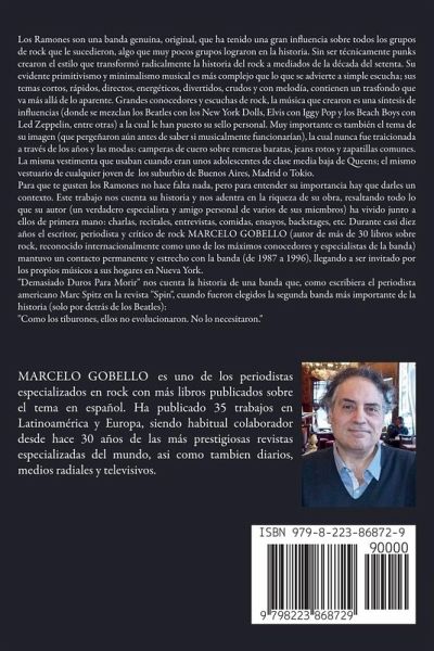 Los Ramones son una banda genuina, original, que ha tenido una gran influencia sobre todos los grupos de rock que le sucedieron, algo que muy pocos grupos lograron en la historia. Sin ser técnicamente punks crearon el estilo que transformó radicalmente la historia del rock a mediados de la década del setenta. Su evidente primitivismo y minimalismo musical es más complejo que lo que se advierte a simple escucha; sus temas cortos, rápidos, directos, energéticos, divertidos, crudos y con melodía, contienen un trasfondo que va más allá de lo aparente. Grandes conocedores y escuchas de rock, la música que crearon es una síntesis de influencias (donde se mezclan los Beatles con los New York Dolls, Elvis con Iggy Pop y los Beach Boys con Led Zeppelin, entre otras) a la cual le han puesto su sello personal. Muy importante es también el tema de su imagen (que pergeñaron aún antes de saber si musicalmente funcionarían), la cual nunca fue traicionada a través de los años y las modas: camperas de cuero sobre remeras baratas, jeans rotos y zapatillas comunes. La misma vestimenta que usaban cuando eran unos adolescentes de clase media baja de Queens; el mismo vestuario de cualquier joven de los suburbio de Buenos Aires, Madrid o Tokio. Para que te gusten los Ramones no hace falta nada, pero para entender su importancia hay que darles un contexto. Este trabajo nos cuenta su historia y nos adentra en la riqueza de su obra, resaltando todo lo que su autor (un verdadero especialista y amigo personal de varios de sus miembros) ha vivido junto a ellos de primera mano: charlas, recitales, entrevistas, comidas, ensayos, backstages, etc. Durante casi diez años el escritor, periodista y crítico de rock MARCELO GOBELLO (autor de más de 30 libros sobre rock, reconocido internacionalmente como uno de los máximos conocedores y especialistas de la banda) mantuvo un contacto permanente y estrecho con la banda (de 1987 a 1996), llegando a ser invitado por los propios músicos a sus hogares en Nueva York. "Demasiado Duros Para Morir" nos cuenta la historia de una banda que, como escribiera el periodista americano Marc Spitz en la revista "Spin", cuando fueron elegidos la segunda banda más importante de la historia (solo por detrás de los Beatles): "Como los tiburones, ellos no evolucionaron. No lo necesitaron."