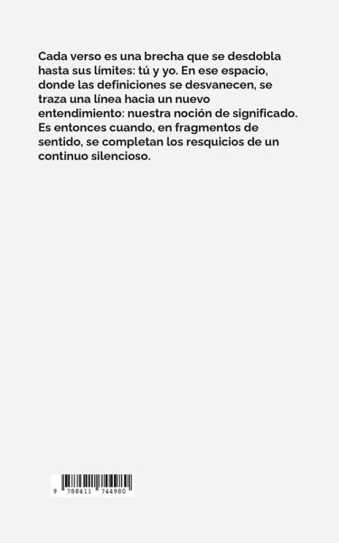 Cada verso es una brecha que se desdobla hasta sus límites: tú y yo. En ese espacio, donde las definiciones se desvanecen, se traza una línea hacia un nuevo entendimiento: nuestra noción de significado. Es entonces cuando, en fragmentos de sentido, se completan los resquicios de un continuo silencioso.