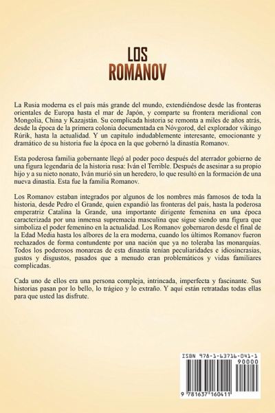 Si quiere descubrir la fascinante historia de los Romanov, entonces siga leyendo... Un capítulo indudablemente interesante, emocionante y dramático de la historia rusa fue la época en la que gobernó la dinastía Romanov. Esta poderosa familia gobernante llegó al poder poco después del aterrador gobierno de una figura legendaria de la historia rusa: Iván el Terrible. Después de asesinar a su propio hijo y a su nieto nonato, Iván murió sin un heredero, lo que resultó en la formación de una nueva dinastía. Esta fue la familia Romanov. Los Romanov estaban integrados por algunos de los nombres más famosos de toda la historia, desde Pedro el Grande, quien expandió las fronteras del país, hasta la poderosa emperatriz Catalina la Grande, una poderosa dirigente femenina en una época caracterizada por una inmensa supremacía masculina y que sigue siendo una figura que simboliza el poder femenino en la actualidad. Los Romanov gobernaron desde el final de la Edad Media hasta los albores de la era moderna, cuando los últimos Romanov fueron rechazados de forma contundente por una nación que ya no toleraba las monarquías. Cada uno de los poderosos monarcas de esta dinastía tenía peculiaridades e idiosincrasias, gustos y disgustos, pasados que a menudo eran problemáticos y vidas familiares complicadas. Cada uno de ellos era una persona compleja, intrincada, imperfecta y fascinante. Sus historias pasan por lo bello, lo trágico y lo extraño. Y en este libro, todas ellas están retratadas para que las disfrute. En Los Romanovs: Una guía fascinante sobre la última dinastía imperial que gobernó Rusia y el impacto que la familia Romanov tuvo en la historia rusa, descubrirá temas como:Rusia antes de los Romanov Los primeros Romanov Un tutor perverso Los hijos de Alexis Pedro el Grande La primera emperatriz Los emperadores y las emperatrices jóvenes Catalina la Grande El zar loco La censura y la emancipación Un final sangriento para una dinastía gobernante ¡Y mucho, mucho más! ¡Adquiera este libro ahora para aprender más sobre los Romanov!