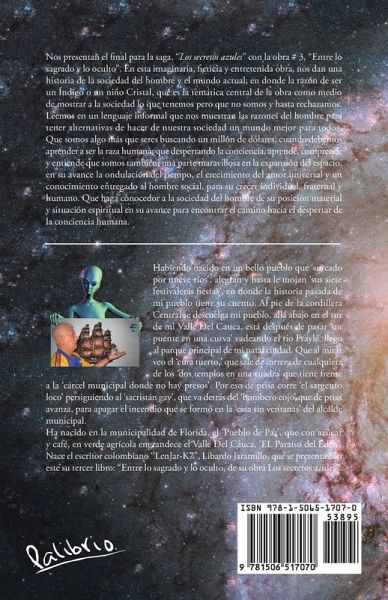 Nos presentan el final para la saga, "Los secretos azules" con la obra # 3, "Entre lo sagrado y lo oculto". En esta imaginaria, ficticia y entretenida obra, nos dan una historia de la sociedad del hombre y el mundo actual; en donde la razón de ser un Índigo o un niño Cristal, qué es la temática central de la obra como medio de mostrar a la sociedad lo que tenemos pero que no somos y hasta rechazamos. Leemos en un lenguaje informal que nos muestran las razones del hombre para tener alternativas de hacer de nuestra sociedad un mundo mejor para todos. Que somos algo más que seres buscando un millón de dólares, cuando debemos aprender a ser la raza humana; que despertando la conciencia, aprende, comprende y entiende que somos también, una parte maravillosa en la expansión del espacio, en su avance la ondulación del tiempo, el crecimiento del amor universal y un conocimiento entregado al hombre social, para su crecer individual, fraternal y humano. Que haga conocedor a la sociedad del hombre de su posición material y situación espiritual en su avance para encontrar el camino hacia el despertar de la conciencia humana.
