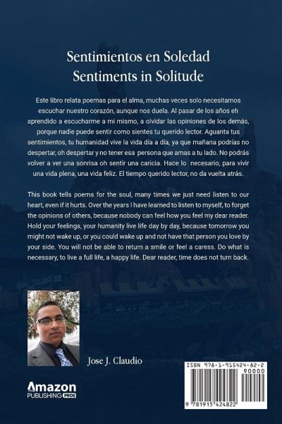 Este libro relata poemas para el alma, muchas veces solo necesitamos escuchar nuestro corazón, aunque nos duela. Al pasar de los años eh aprendido a escucharme a mi mismo, a olvidar las opiniones de los demás, porque nadie puede sentir como sientes tu querido lector. Aguanta tus sentimientos, tu humanidad vive la vida día a día, ya que mañana podrías no despertar, oh despertar y no tener esa persona que amas a tu lado. No podrás volver a ver una sonrisa oh sentir una caricia. Hace lo necesario, para vivir una vida plena, una vida feliz. El tiempo querido lector, no da vuelta atrás. This book tells poems for the soul, many times we just need listen to our heart, even if it hurts. Over the years I have learned to listen to myself, to forget the opinions of others, because nobody can feel how you feel my dear reader. Hold your feelings, your humanity live life day by day, because tomorrow you might not wake up, or you could wake up and not have that person you love by your side. You will not be able to return a smile or feel a caress. Do what is necessary, to live a full life, a happy life. Dear reader, time does not turn back.