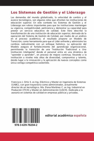 Las demandas del mundo globalizado, la velocidad de cambio y el avance tecnológico, son algunos retos que afrontan las instituciones de educación superior. En este contexto los Sistemas de Gestión y el Liderazgo son rubros importantes para que las instituciones mantengan su vigencia, competitividad, pertinencia y demostrar su capacidad para prestar un servicio educativo de calidad. Este libro describe la transformación de una institución de educación superior, derivada de la operación del Sistema de Gestión de Calidad, por medio de un análisis en el proceso académico; el resultado propone un Modelo de Transición; como herramienta para que el Líder enfrente y administre los cambios radicalmente con un enfoque holístico. La aplicación del Modelo asegura el fortalecimiento del aprendizaje organizacional, permitiendo la transición de una "Institución Tradicional a Una Institución Inteligente" donde el personal entra en una dinámica de "aprender a aprender", en proceso de mejora continua; llevando a la institución a niveles más altos de diversidad, compromiso y talento, dando lugar a la innovación y la aplicación de nuevos conceptos como única ventaja competitiva sostenible.