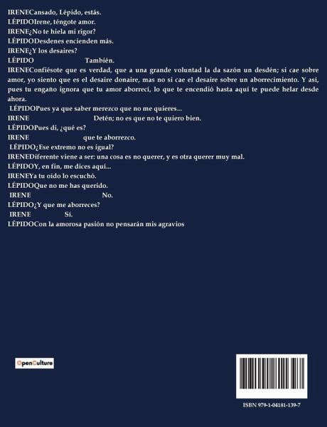 IRENECansado, Lépido, estás. LÉPIDOIrene, téngote amor. IRENE¿No te hiela mi rigor? LÉPIDODesdenes encienden más. IRENE¿Y los desaires? LÉPIDO También. IRENEConfiésote que es verdad, que a una grande voluntad la da sazón un desdén; si cae sobre amor, yo siento que es el desaire donaire, mas no si cae el desaire sobre un aborrecimiento. Y así, pues tu engaño ignora que tu amor aborrecí, lo que te encendió hasta aquí te puede helar desde ahora. LÉPIDOPues ya que saber merezco que no me quieres... IRENE Detén; no es que no te quiero bien. LÉPIDOPues di, ¿qué es? IRENE que te aborrezco. LÉPIDO¿Ese extremo no es igual? IRENEDiferente viene a ser: una cosa es no querer, y es otra querer muy mal. LÉPIDOY, en fin, me dices aquí... IRENEYa tu oído lo escuchó. LÉPIDOQue no me has querido. IRENE No. LÉPIDO¿Y que me aborreces? IRENE Sí. LÉPIDOCon la amorosa pasión no pensarán mis agravios