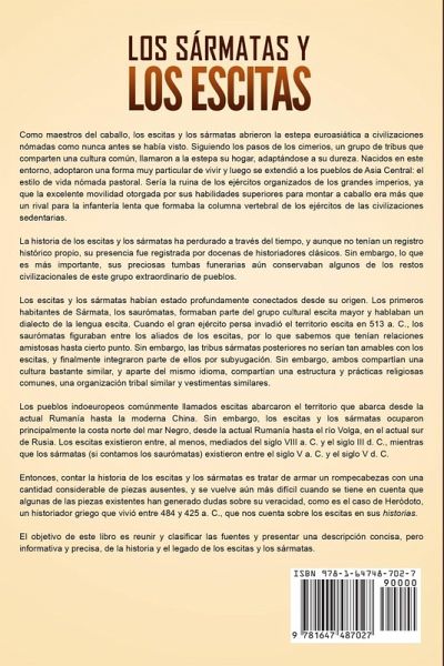 Si desea descubrir la fascinante historia de los sármatas y los escitas, siga leyendo... Como maestros del caballo, los escitas y los sármatas abrieron la estepa euroasiática a civilizaciones nómadas como nunca antes se había visto. Por primera vez, un grupo de tribus que comparten una cultura común llamaron a la estepa su hogar, adaptándose a su crueldad. Nacidos en este entorno, adoptaron una forma muy particular de vivir y luego se extendió a los pueblos de Asia Central: el estilo de vida nómada pastoral. Sería la ruina de los ejércitos organizados de los grandes imperios, ya que la excelente movilidad otorgada por sus habilidades superiores de equitación no era rival en comparación con la infantería lenta y organizada. La historia de los escitas y los sármatas ha perdurado a través de la historia, y aunque no tenían un registro histórico propio, su presencia fue registrada por docenas de historiadores clásicos. Sin embargo, lo que es más importante, sus preciosas tumbas funerarias aún conservaban algunos de los restos civilizacionales de este grupo extraordinario de pueblos. En Los sármatas y los escitas: Una guía fascinante sobre los bárbaros de origen iraní y cómo estas tribus antiguas lucharon contra el Imperio romano, los godos, los hunos y los persas, descubrirá los siguientes temas:Los orígenes de los escitas y los sármatas El arte, la cultura y la religión La economía y la sociedad La guerra y la conquista El fin de los escitas y los sármatas ¡Y mucho, mucho más! ¡Obtenga este libro ahora para conocer más sobre Los sármatas y los escitas!