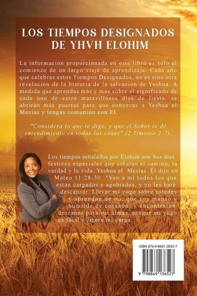 La información proporcionada en este libro es sólo el comienzo de un largo viaje de aprendizaje. Cada año que celebras estos Tiempos Designados, no es sino otra revelación de la historia de la salvación de Yeshua. A medida que aprendas más y más sobre el significado de cada uno de estos maravillosos días de fiesta, se abrirán más puertas para que conozcas a Yeshua el Mesías y tengas comunión con El. "Considera lo que te digo, y que el Señor te dé entendimiento en todas las cosas" (2 Timoteo 2:7). Los tiempos señalados por Elohim son Sus días festivos especiales que señalan el camino, la verdad y la vida, Yeshua el Mesías. Él dijo en Mateo 11:28-30: "Ven a mí todos los que están cargados y agobiados, y yo les haré descansar. Llevar mi yugo sobre ustedes y aprendan de mí, que soy manso y humilde de corazón, y encontraran descanso para sus almas, porque mi yugo es fácil y ligera mi carga.