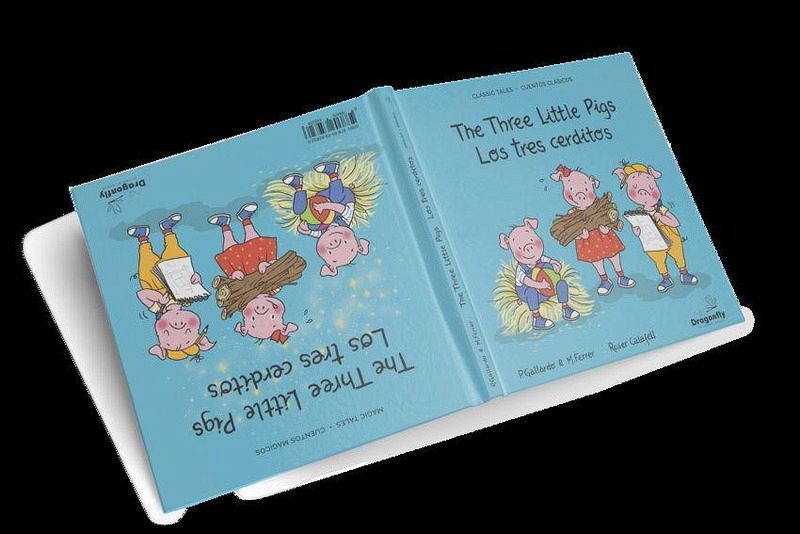 Se trata de dos versiones del cuento clásico en el mismo libro, de Los tres cerditos, la versión clásica, con el lobo malo que intenta comerse a los cerditos y la versión mágica en la que el lobo es un lobo bueno que busca hacerse amigo de los tres cerditos.Bilingües en inglés y español, adaptado a cada idioma por filólogos de los respectivos idiomas, de manera que los niños desde tempranas edades, vayan escuchando dos idiomas de manera natural.Todas las ilustraciones cuentan con un juego de encontrar la libélula, para hacer la lectura aún más divertida.
