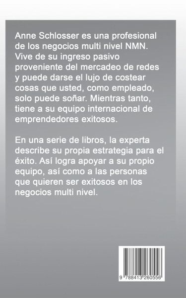 Anne Schlosser es una profesional de los negocios multi nivel NMN. Vive de su ingreso pasivo proveniente del mercadeo de redes y puede darse el lujo de costear cosas que usted, como empleado, solo puede soñar. Mientras tanto, tiene a su equipo internacional de emprendedores exitosos. En una serie de libros, la experta describe su propia estrategia para el éxito. Así logra apoyar a su propio equipo, así como a las personas que quieren ser exitosos en los negocios multi nivel.