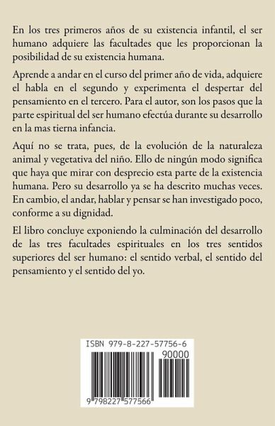 En los tres primeros años de su existencia infantil, el ser humano adquiere las facultades que les proporcionan la posibilidad de su existencia humana. Aprende a andar en el curso del primer año de vida, adquiere el habla en el segundo y experimenta el despertar del pensamiento en el tercero. Para el autor, son los pasos que la parte espiritual del ser humano efectúa durante su desarrollo en la mas tierna infancia. Aquí no se trata, pues, de la evolución de la naturaleza animal y vegetativa del niño. Ello de ningún modo significa que haya que mirar con desprecio esta parte de la existencia humana. Pero su desarrollo ya se ha descrito muchas veces. En cambio, el andar, hablar y pensar se han investigado poco, conforme a su dignidad. El libro concluye exponiendo la culminación del desarrollo de las tres facultades espirituales en los tres sentidos superiores del ser humano: el sentido verbal, el sentido del pensamiento y el sentido del yo.