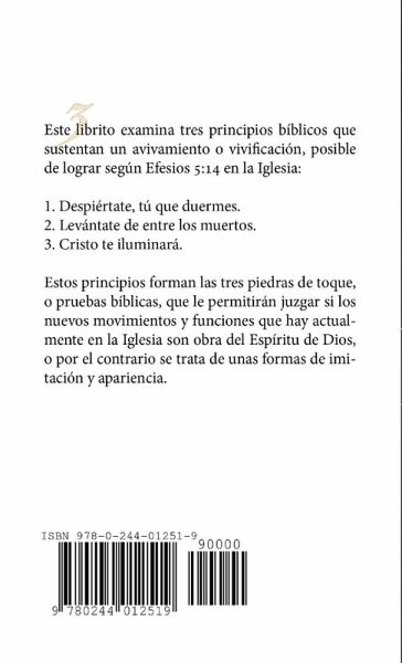Este librito examina tres principios bíblicos que sustentan un avivamiento o vivificación, posible de lograr según Efesios 5:14 en la Iglesia. Forman las tres piedras de toque, o pruebas bíblicas, que le permitirán juzgar si los nuevos movimientos y funciones que hay actualmente en la Iglesia son obra del Espíritu de Dios, o por el contrario se trata de unas formas de imitación y apariencia.