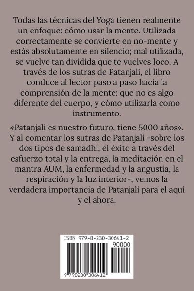 Todas las técnicas del Yoga tienen realmente un enfoque: cómo usar la mente. Utilizada correctamente se convierte en no-mente y estás absolutamente en silencio; mal utilizada, se vuelve tan dividida que te vuelves loco. A través de los sutras de Patanjali, el libro conduce al lector paso a paso hacia la comprensión de la mente: que no es algo diferente del cuerpo, y cómo utilizarla como instrumento. Patanjali es nuestro futuro, tiene 5000 años. Y al comentar los sutras de Patanjali -sobre los dos tipos de samadhi, el éxito a través del esfuerzo total y la entrega, la meditación en el mantra AUM, la enfermedad y la angustia, la respiración y la luz interior-, vemos la verdadera importancia de Patanjali para el aquí y el ahora.