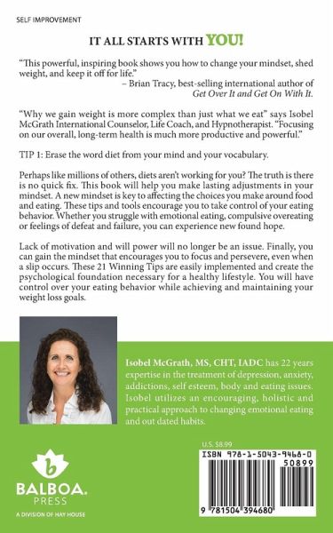 IT ALL STARTS WITH YOU! This powerful, inspiring book shows you how to change your mindset, shed weight, and keep it off for life. Brian Tracy, best-selling international author of Get Over It and Get On With It. Why we gain weight is more complex than just what we eat says Isobel McGrath International Counselor, Life Coach, and Hypnotherapist. Focusing on our overall, long-term health is much more productive and powerful. TIP 1: Erase the word diet from your mind and your vocabulary. Perhaps like millions of others, diets arent working for you? The truth is there is no quick fix. This book will help you make lasting adjustments in your mindset. A new mindset is key to affecting the choices you make around food and eating. These tips and tools encourage you to take control of your eating behavior. Whether you struggle with emotional eating, compulsive overeating or feelings of defeat and failure, you can experience new found hope. Lack of motivation and will power will no longer be an issue. Finally, you can gain the mindset that encourages you to focus and persevere, even when a slip occurs. These 21 Winning Tips are easily implemented and create the psychological foundation necessary for a healthy lifestyle. You will have control over your eating behavior while achieving and maintaining your weight loss goals.