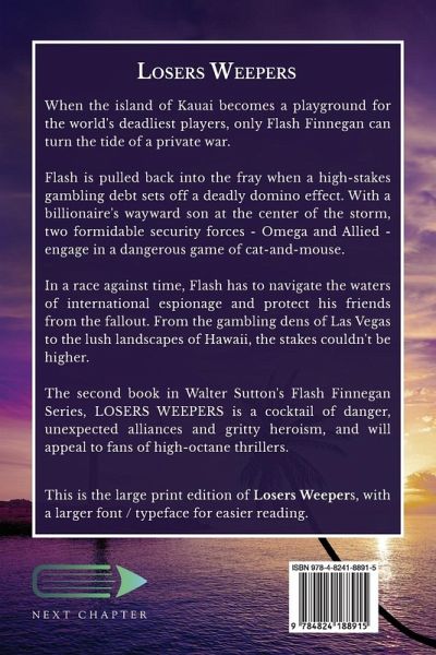 When the island of Kauai becomes a playground for the world's deadliest players, only Flash Finnegan can turn the tide of a private war. Flash is pulled back into the fray when a high-stakes gambling debt sets off a deadly domino effect. With a billionaire's wayward son at the center of the storm, two formidable security forces - Omega and Allied - engage in a dangerous game of cat-and-mouse. In a race against time, Flash has to navigate the waters of international espionage and protect his friends from the fallout. From the gambling dens of Las Vegas to the lush landscapes of Hawaii, the stakes couldn't be higher. The second book in Walter Sutton's Flash Finnegan Series, LOSERS WEEPERS is a cocktail of danger, unexpected alliances and gritty heroism, and will appeal to fans of high-octane thrillers. This is the large print edition of Losers Weepers, with a larger font / typeface for easier reading.