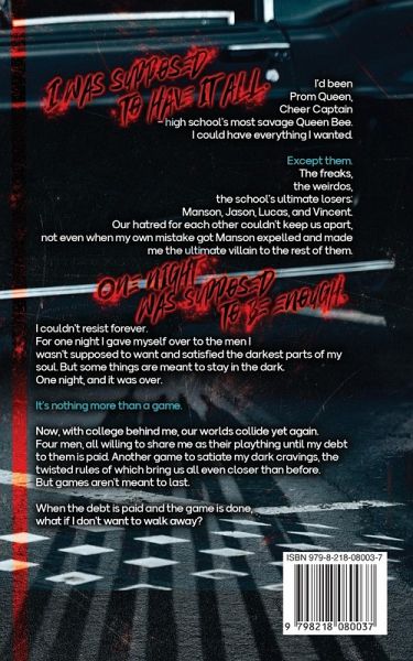 I was supposed to have it all. I'd been Prom Queen, Cheer Captain - high school's most savage Queen Bee. I could have everything I wanted. Except them. The freaks, the weirdos, the school's ultimate losers: Manson, Jason, Lucas, and Vincent. Our hatred for each other couldn't keep us apart, not even when my own mistake got Manson expelled and made me the ultimate villain to the rest of them. One night was supposed to be enough. I couldn't resist forever. For one night I gave myself over to the men I wasn't supposed to want and satisfied the darkest parts of my soul. But some things are meant to stay in the dark. One night, and it was over. Nothing more than a game. Now, with college behind me, our worlds collide yet again. Four men, all willing to share me as their plaything until my debt to them is paid. Another game to satiate my dark cravings, the twisted rules of which bring us all even closer than before. But games aren't meant to last. When the debt is paid and the game is done, what if I don't want to walk away? Although not required, it is recommended to read the novella, The Dare, prior to reading Losers. This book is part 1 of a duet. It is is First Person, Multi POV. Losers is an 18+ polyamorous bisexual romance between one woman and four men, including MF, MM, and group scenes. Reader discretion is strongly advised, this is a dark read. This book contains graphic sexual scenes, intense scenes of BDSM, graphic violence, and strong language. A full content note can be found in the front matter of the book.
