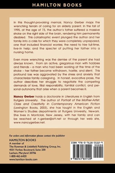 In this thought-provoking memoir, Nancy Gerber maps the wrenching terrain of caring for an elderly parent. In the fall of 1995, at the age of 73, the author's father suffered a massive stroke on the right side of the brain, rendering him permanently disabled. This catastrophic event plunged the author and her family into a crisis for which they were completely unprepared, one that included financial worries; the need to hire full-time, live-in help; and the specter of putting her father into a nursing home.