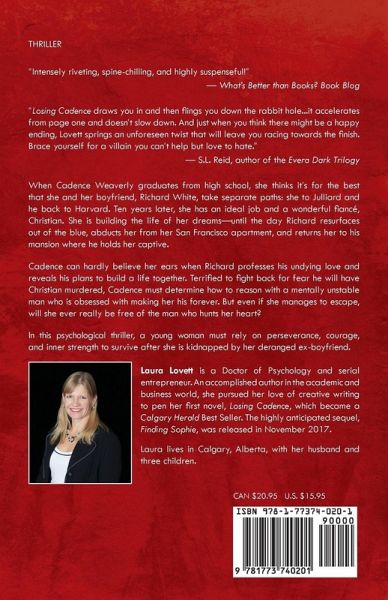 Laura Lovett is a Doctor of Psychology and serial entrepreneur. An accomplished author in the academic and business world, she pursued her love of creative writing to pen her first novel, Losing Cadence, which became a Calgary Herald Best Seller. This much-anticipated sequel, Finding Sophie, is Laura's second novel. Laura lives in Calgary, Alberta, with her husband, three children, and miniature American Eskimo dog, Ghost. Her businesses include Canada Career Counselling, Work EvOHlution and the Leadership Success Group. In her free time, she enjoys wine, squash, golf, walks, hot tubbing, the Rocky Mountains and travel.