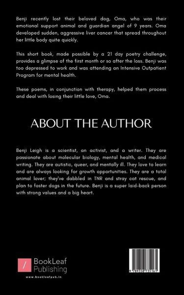 Benji recently lost their beloved dog, Oma, who was their emotional support animal and guardian angel of 9 years. Oma developed sudden, aggressive liver cancer that spread throughout her little body quite quickly. This short book, made possible by a 21 day poetry challenge, provides a glimpse of the first month or so after the loss. Benji was too depressed to work and was attending an Intensive Outpatient Program for mental health. These poems, in conjunction with therapy, helped them process and deal with losing their little love, Oma.