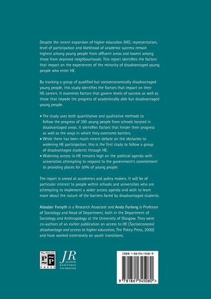 Despite the expansion of higher education, representation, level of participation and likelihood of academic success remain highest amongst young people from affluent areas and lowest amongst those from deprived neighbourhoods. This report identifies factors which impact upon the minority of disadvantaged young people who enter higher education.