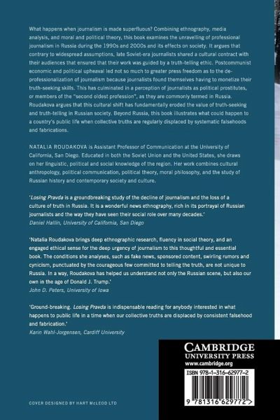 What happens when journalism is made superfluous? Combining ethnography, media analysis, moral and political theory this book examines the unravelling of professional journalism in Russia over the past twenty-five years, and its effects on society. It argues that, contrary to widespread assumptions, late Soviet-era journalists shared a cultural contract with their audiences, which ensured that their work was guided by a truth-telling ethic. Post-communist economic and political upheaval led not so much to greater press freedom as to the de-professionalization of journalism, as journalists found themselves having to monetize their truth-seeking skills. This has culminated in a perception of journalists as political prostitutes, or members of the 'second oldest profession', as they are commonly termed in Russia. Roudakova argues that this cultural shift has fundamentally eroded the value of truth-seeking and telling in Russian society.
