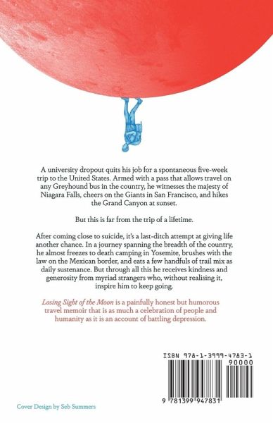 A university dropout quits his job for a spontaneous five-week trip to the United States. Armed with a pass that allows travel on any Greyhound bus in the country, he witnesses the majesty of Niagara Falls, cheers on the Giants in San Francisco, and hikes the Grand Canyon at sunset. But this is far from the trip of a lifetime. After coming close to suicide, it's a last-ditch attempt at giving life another chance. In a journey spanning the breadth of the country, he almost freezes to death camping in Yosemite, brushes with the law on the Mexican border, and eats a few handfuls of trail mix as daily sustenance. But through all this he receives kindness and generosity from myriad strangers who, without realising it, inspire him to keep going. Losing Sight of the Moon is a painfully honest travel memoir that is as much a celebration of humanity as an account of battling depression.