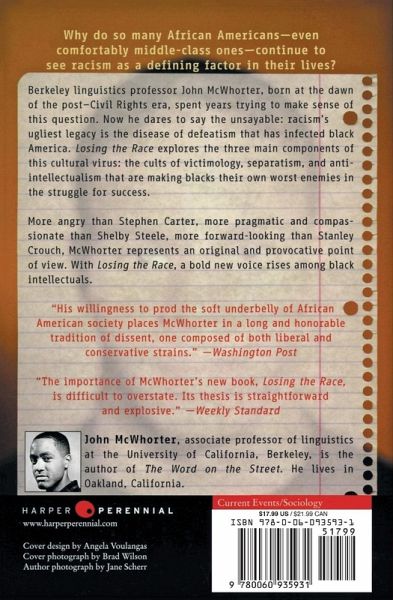 Why do so many African Americans--even comfortably middle-class ones--continue to see racism as a defining factor in their lives? Columbia University linguistics professor John McWhorter, born at the dawn of the post-Civil Rights era, spent years trying to make sense of this question. In this book he dared to say the unsayable: racism's ugliest legacy is the disease of defeatism that has infected Black America. Losing the Race explores the three main components of this cultural virus: the cults of victimology, separatism, and anti-intellectualism that are making Black people their own worst enemies in the struggle for success. With Losing the Race, a bold new voice rises among Black intellectuals.