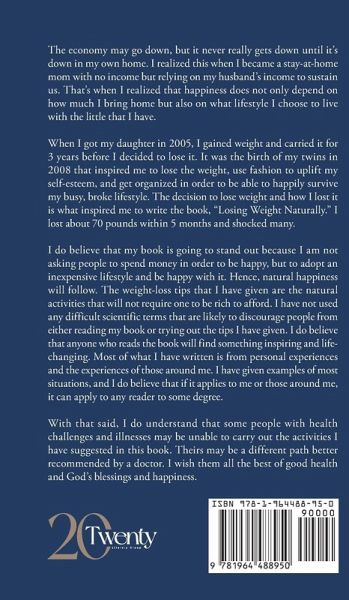 The economy may go down, but it never really gets down until it's down in my own home. I realized this when I became a stay-at-home mom with no income but relying on my husband's income to sustain us. That's when I realized that happiness does not only depend on how much I bring home but also on what lifestyle I choose to live with the little that I have. When I got my daughter in 2005, I gained weight and carried it for 3 years before I decided to lose it. It was the birth of my twins in 2008 that inspired me to lose the weight, use fashion to uplift my self-esteem, and get organized in order to be able to happily survive my busy, broke lifestyle. The decision to lose weight and how I lost it is what inspired me to write the book, "Losing Weight Naturally." I lost about 70 pounds within 5 months and shocked many. I do believe that my book is going to stand out because I am not asking people to spend money in order to be happy, but to adopt an inexpensive lifestyle and be happy with it. Hence, natural happiness will follow. The weight-loss tips that I have given are the natural activities that will not require one to be rich to afford. I have not used any difficult scientific terms that are likely to discourage people from either reading my book or trying out the tips I have given. I do believe that anyone who reads the book will find something inspiring and life-changing. Most of what I have written is from personal experiences and the experiences of those around me. I have given examples of most situations, and I do believe that if it applies to me or those around me, it can apply to any reader to some degree. With that said, I do understand that some people with health challenges and illnesses may be unable to carry out the activities I have suggested in this book. Theirs may be a different path better recommended by a doctor. I wish them all the best of good health and God's blessings and happiness.