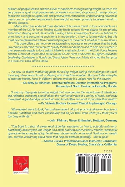 Millions of people seek to achieve a level of happiness through losing weight. To reach this very personal goal, most people seek convenient commercial options of mass-produced foods that are high in sugars, salt, and preservatives, without the understanding how those items can complicate the process to lose weight and even possibly increase the risk one's body to chronic diseases. Marty Khan has endured three decades of business travel in four continents as a member of the US Air Force. Finding quality foods to keep fit was always his top priority even when staying in first class hotels. Having a basic knowledge of what is nutritious for one's body, and consuming such items in moderation, is key to losing weight. But this must be complemented with a consistent program of movement activities to burn calories.This book offers a common-sense approach to increase one's awareness that the body is a complex machine that requires quality food in moderation and to help one succeed in their personal struggle to lose weight. Marty is a retired colonel in the US Air Force Reserve and the author of Uncommon Duties in the US Air Force and Access to Higher Education: Leadership Challenges in Florida and South Africa. Years ago, Marty clinched the first prize in a local chili cook-off in Florida.