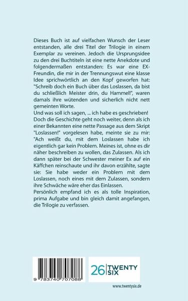 Dieses Buch ist auf vielfachen Wunsch der Leser entstanden, alle drei Titel der Trilogie in einem Exemplar zu vereinen. Jedoch die Ursprungsidee zu den drei Buchtiteln ist eine nette Anekdote und folgendermaßen entstanden: Es war eine EX-Freundin, die mir in der Trennungswut eine klasse Idee sprichwörtlich an den Kopf geworfen hat: "Schreib doch ein Buch über das Loslassen, da bist du schließlich Meister drin, du Hammel!", waren damals ihre wütenden und sicherlich nicht nett gemeinten Worte.Und was soll ich sagen, ... ich habe es geschrieben!Doch die Geschichte geht noch weiter, denn als ich einer Bekannten eine nette Passage aus dem Skript "Loslassen!" vorgelesen habe, meinte sie zu mir: "Ach weißt du, mit dem Loslassen habe ich eigentlich gar kein Problem. Meines ist, ohne es dir näher beschreiben zu wollen, das Zulassen." Als ich dann später bei der Schwester meiner Ex auf ein Käffchen reinschaute und ihr davon erzählte, sagte sie: Sie habe weder ein Problem mit dem Loslassen, noch eines mit dem Zulassen, sondern ihre Schwäche wäre eher das Einlassen.Was soll ich noch sagen? Ich empfand es als tolle Inspiration, prima Aufgabe und bin gleich damit angefangen, die Trilogie zu verfassen.