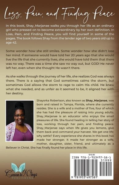 In this book, Shay_Marjanae walks you through her life as an ordinary girl who pressed on to become extraordinary by her own definition. In Loss, Pain, and Finding Peace, you will find yourself in some of the pages. The book follows Shay from the tender age of two years old up to age 42. Some wonder how she still smiles. Some wonder how she didn't lose her mind. If someone would have told her 20 years ago that she would live the life that she currently lives, she would have told them that there was no way. There was a time she saw no way out, but GOD! He never left her, even when she thought He wasn't there. As she walks through the journey of her life, she realizes God was always there. There is a saying that God sometimes calms the storm, but sometimes God allows the storm to rage to calm His child. He knew what she needed, and as unfair as it seemed to be, it aligned her with her destiny.