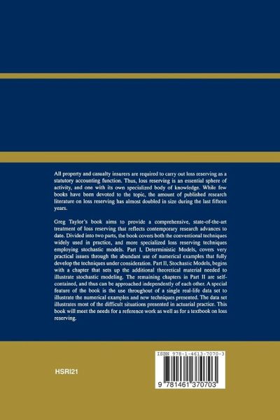 Greg Taylor's book aims to provide a comprehensive, state-of-the-art treatment of loss reserving that reflects contemporary research advances to date. Divided into two parts, the book covers both the conventional techniques widely used in practice, and more specialized loss reserving techniques employing stochastic models. Part I, Deterministic Models, covers very practical issues through the abundant use of numerical examples that fully develop the techniques under consideration. Part II, Stochastic Models, begins with a chapter that sets up the additional theoretical material needed to illustrate stochastic modeling. The remaining chapters in Part II are self-contained, and thus can be approached independently of each other. A special feature of the book is the use throughout of a single real life data set to illustrate the numerical examples and new techniques presented. The data set illustrates most of the difficult situations presented in actuarial practice. This book will meet the needs for a reference work as well as for a textbook on loss reserving.