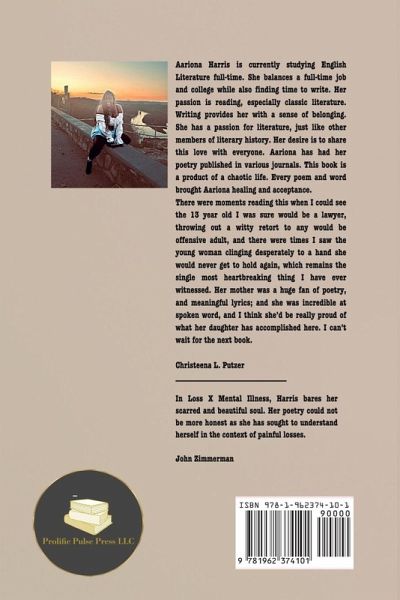 Loss X Mental Illness is a collection of poems written by Aariona Harris during one of the most emotionally and mentally challenging times of her life. The goal with these poems was to offer solidarity to other readers who may go through something similar and ensure they knew they were not alone. While doing so Harris addressed her grief and to expel all the feelings associated with it, with the emotional reactions caused by her diagnoses. What reviewers say: ¿¿There were moments reading this when I could see the 13 year old I was sure would be a lawyer, throwing out a witty retort to any would be offensive adult, and there were times I saw the young woman clinging desperately to a hand she would never get to hold again, which remains the single most heartbreaking thing I have ever witnessed. Her mother was a huge fan of poetry, and meaningful lyrics; and she was incredible at spoken word, and I think she'd be really proud of what her daughter has accomplished here. I can't wait for the next book. Christeena L. Putzer ¿¿¿Aariona Harris' captured so many emotions and feelings in her book "Loss X Mental Illness". With each poem you can feel the emotions that are wrapped around every word. You can tell that the author has gone through so much in her short life. While reading I was shocked and amazed by what she has faced in a short amount of time. Not only does she bring attention to very important topics, she expands on them. This is a raw and honest view of mental health struggles at a young age. Grappling with life challenges that seem almost insurmountable including the loss of a mother, this narrative resonates deeply as it mirrors the silent battles that many young individuals face into today's world. Aariona's writing is viewed with a sense of resilience and hope as she navigates these challenges. It encourages a deeper understanding and empathy of those who battle mental health issues often in silence. The book is a beacon of hope and understanding. A reminder that even in our darkest time there is light to be found. ¿¿¿¿Rebecca Durgin ¿¿In Loss X Mental Illness, Harris bares her scarred and beautiful soul. Her poetry could not be more honest as she has sought to understand herself in the context of painful losses. John Zimmerman