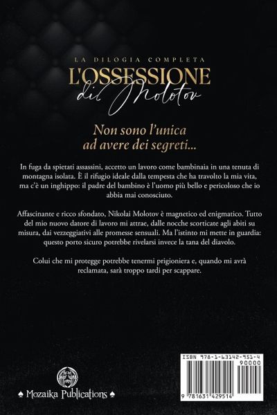 Non sono l'unica ad avere dei segreti... In fuga da spietati assassini, accetto un lavoro come bambinaia in una tenuta di montagna isolata. È il rifugio ideale dalla tempesta che ha travolto la mia vita, ma c'è un inghippo: il padre del bambino è l'uomo più bello e pericoloso che io abbia mai conosciuto. Affascinante e ricco sfondato, Nikolai Molotov è magnetico ed enigmatico. Tutto del mio nuovo datore di lavoro mi attrae, dalle nocche scorticate agli abiti su misura, dai vezzeggiativi alle promesse sensuali. Ma l'istinto mi mette in guardia: questo porto sicuro potrebbe rivelarsi invece la tana del diavolo. Colui che mi protegge potrebbe tenermi prigioniera e, quando mi avrà reclamata, sarà troppo tardi per scappare. Nota: questo cofanetto include La Tana del Diavolo e La Gabbia dell'Angelo ed è la storia completa di Nikolai e Chloe.