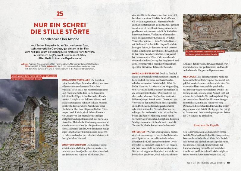 Willkommen bei den "Lost & Dark Places Nürnberg, Fürth, Erlangen"! Dieses einzigartige Buch nimmt Sie mit auf eine spannende Reise zu den dunklen, verlassenen und vergessenen Orte dieser drei Städte. "Falls man sie zwinge, dorthin zu gehen, (sie) lieber den Tod aussuchen würde." Ein Satz, der Grauenhaftes erahnen lässt. Und tatsächlich, es gibt sie, ob in Nürnberg, Fürth oder Erlangen: düstere Orte abseits der ausgetretenen Touristenpfade. Denn das fränkische Städtetrio hat viel mehr zu bieten als prachtvolle Kaiserburg, historische Eisenbahn oder gesellige Bergkirchweih. Es gibt Orte, an denen einem unwillkürlich die Haare zu Berge stehen. Man rätselt, warum der Putz so bekümmert von den Wänden blättert. Und weshalb so eine düster drückende Stille herrscht, unterbrochen nur von unheimlichem Knarzen. Oder man fragt sich, wieso man eine Gänsehaut bekommt. Ist es der kalte Hauch des Todes an den dunklen Ufern des unsanft ruhenden Sees?