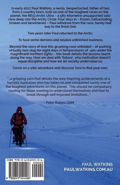 In early 2017 Paul Watkins, a nerdy, bespectacled, father of two from a country town, took on one of the toughest races on the planet, the 6633 Arctic Ultra - a 583-kilometre unsupported solo race deep into the Arctic Circle. Four days in - frozen, hallucinating, broken and bewildered - Paul withdrew from the race, barely half way to the finish line. Two years later Paul returned to the Arctic. To face some demons and resolve unfinished business. Beyond the story of how this gruelling race unfolded - of pushing virtually non-stop for eight days in temperatures of -40c under the magnificent northern lights - this book details the lessons learnt along the way. How we deal with 'failure', why motivation doesn't equal discipline and how we let society undervalue us. Come on a wild adventure and discover how to find your own.