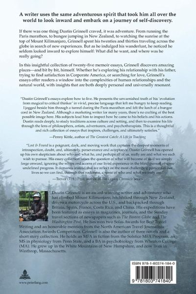 «Lost & Found is a poignant, dark, and moving work that captures the deepest moments of introspection, doubt, and, ultimately, perseverance and acceptance. Dustin Grinnell has opened up his own skepticism about who and what he, and perhaps all of us, really are and what we each wish to pursue. His essay collection raises the question of what will become of us if we simply forge onward, ignoring the whips and scorns of our lived experience in the blind pursuit of some undefined progress. It demands instead that we reflect on the most challenging portions of our lives so we can find, through that rockiness, a sense of who and what we truly are.»