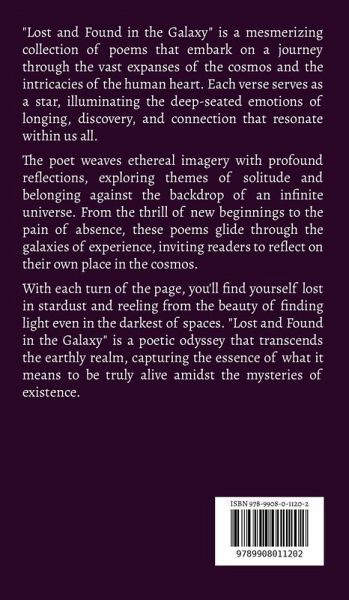"Lost and Found in the Galaxy" is a mesmerizing collection of poems that embark on a journey through the vast expanses of the cosmos and the intricacies of the human heart. Each verse serves as a star, illuminating the deep-seated emotions of longing, discovery, and connection that resonate within us all. The poet weaves ethereal imagery with profound reflections, exploring themes of solitude and belonging against the backdrop of an infinite universe. From the thrill of new beginnings to the pain of absence, these poems glide through the galaxies of experience, inviting readers to reflect on their own place in the cosmos. With each turn of the page, you'll find yourself lost in stardust and reeling from the beauty of finding light even in the darkest of spaces. "Lost and Found in the Galaxy" is a poetic odyssey that transcends the earthly realm, capturing the essence of what it means to be truly alive amidst the mysteries of existence.