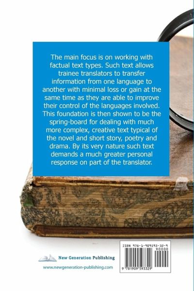 The main focus is on working with factual text types. Such text allows trainee translators to transfer information from one language to another with minimal loss or gain at the same time as they are able to improve their control of the languages involved. This foundation is then shown to be the spring-board for dealing with much more complex, creative text typical of the novel and short story, poetry and drama. By its very nature such text demands a much greater personal response on part of the translator.