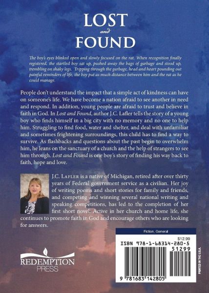 The boy’s eyes blinked open and slowly focused on the rat. When recognition finally registered, the startled boy sat up, pushed away the bags of garbage and stood up, trembling on shaky legs. Tripping through the garbage, head and heart pounding out painful reminders of life, the boy put as much distance between him and the rat as he could manage. People don’t understand the impact that a simple act of kindness can have on someone’s life. We have become a nation afraid to see another in need and respond. In addition, young people are afraid to trust and believe in faith in God. In Lost and Found, author J.C. Lafler tells the story of a young boy who finds himself in a big city with no memory and no one to help him. Struggling to find food, water and shelter, and deal with unfamiliar and sometimes frightening surroundings, this child has to find a way to survive. As flashbacks and questions about the past begin to overwhelm him, he leans on the sanctuary of a church and the help of strangers to see him through. Lost and Found is one boy’s story of finding his way back to faith, hope and love.