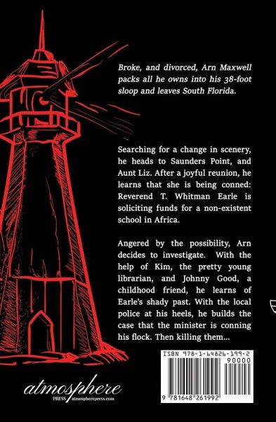 Broke, and divorced, Arn Maxwell packs all he owns into his 38-foot sloop and leaves South Florida. Searching for a change in scenery, he heads to Saunders Point, and Aunt Liz. After a joyful reunion, he learns that she is being conned. Reverend T. Whitman Earle is soliciting funds for a non-existent school in Africa. Angered by the possibility, Arn decides to investigate. With the help of Kim, the pretty young librarian, and Johnny Good, a childhood friend, he learns of Earle's shady past. With the local police at his heels, he builds the case that the minister is conning his flock. Then killing them. When Aunt Liz disappears, Arn takes action. Certain of Earle's guilt, he rushes to the minister's country home only to be captured by the real killer. A man with a grudge, a plan to leave with a lot of money, and a story of greed and revenge. But Aunt Liz has on last trick up her sleeve, and Arn escapes. Frantic, he runs, but is shot. After a night on death's door, Arn is the one that survives. Through it all, Arn Maxwell discovers power of family, the meaning of home, the excitement of new love, and the reward of a good deed done.